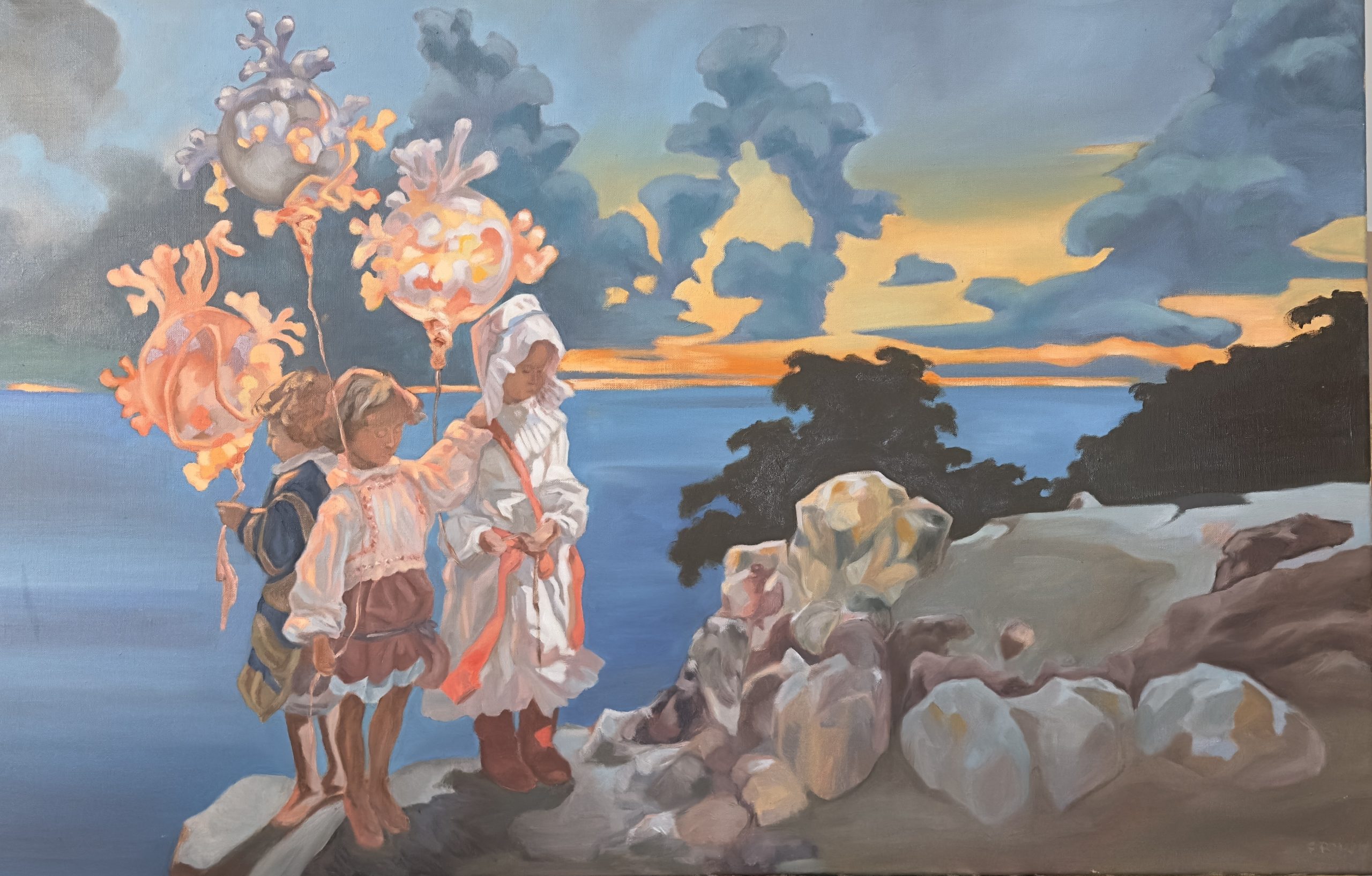The children, holding fragile, glowing forms, stand with innocence , watching a landscape.